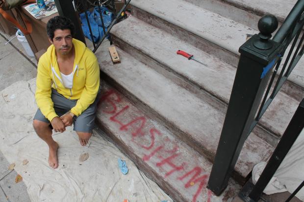 extralargeRemember Matthew Stillman, author of that erotic version of Genesis? Well, some jerk decided to track him down and spraypaint “Blasphmy” on his stoop. Please don’t do this to me! Also, the only blasphemy here is the missing “e”.